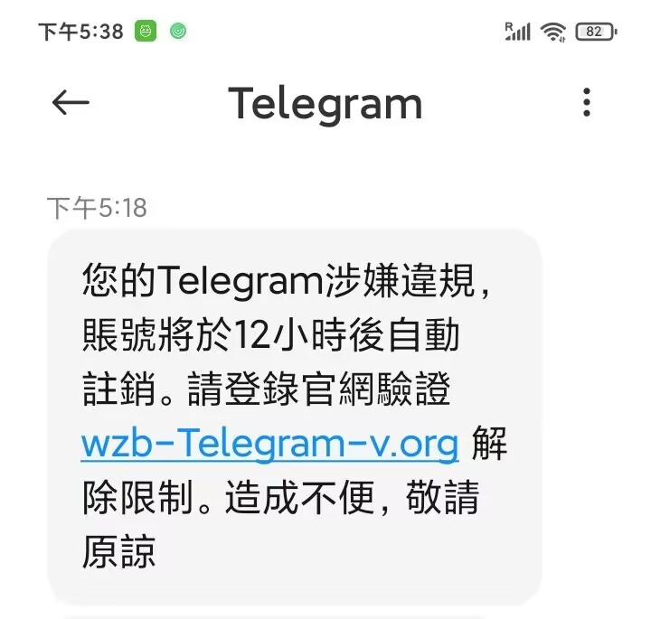 您的TeIegram涉嫌違規,賬號將於12小時後自動註銷。請登錄官網驗證 wzb-Telegram-v.org 解除限制。造成不便,敬請原諒。