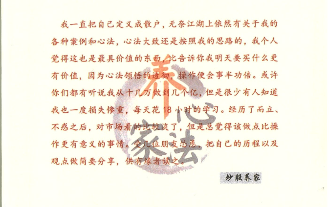 我一直把自己定义成散户,无奈江湖上依然有关于我的各种案例和心法,心法大致还是按照我的思路的,我个人觉得这也是最具价值的东西,比告诉你我明天要买什么更有价值,因为心法领悟的透彻,操作便会事半功倍。或许你们都有听说我从十几万做到几个亿,但是很少有人知道我也一度损失惨重,每天花18小时的学。经历了而立、不惑之后,对市场看的比较淡了,但是总觉得该做点比操作更有意义的事情。受几位朋友的怂恿,把自己的历程以及观点做简要分享,供有缘者读之。————————炒股养家